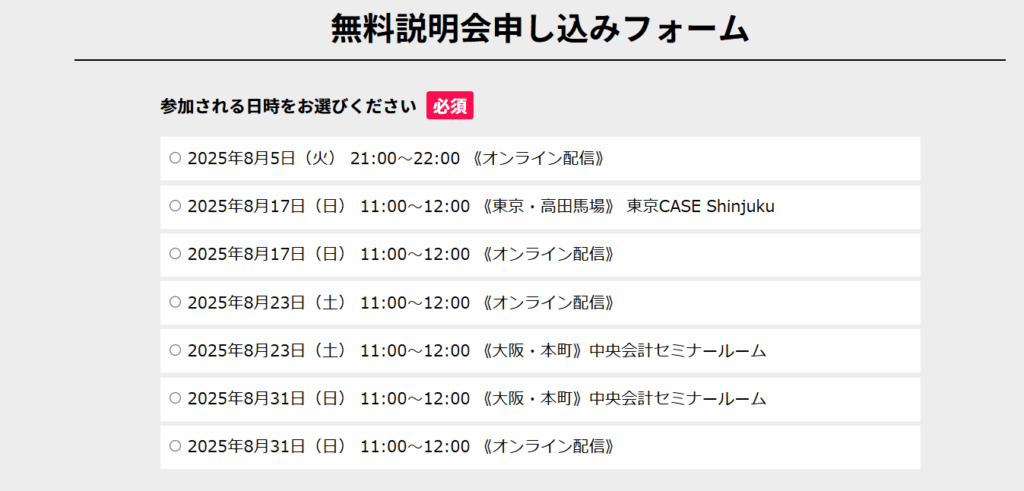 直近でもリアル校、オンライン校共に複数日候補が用意されています。