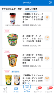 本日ブログを書いている時点では、カップラーメンやスープの引換券が出ていました!