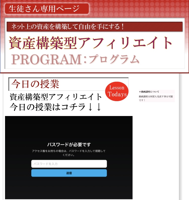 基本的に、毎日1通メールで動画が配信されます。生徒さん専用ページにログインすると動画視聴が可能で、動画によってはパスワードが必要な場合があります。